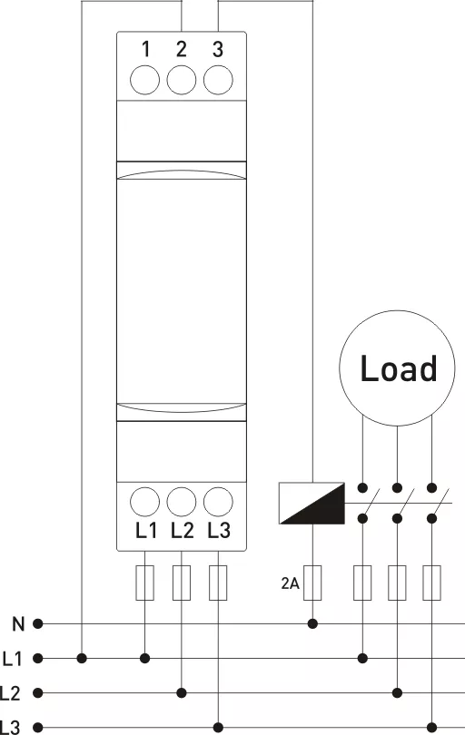 Normalna praca (brak błędu): gdy napięcie, balans i sekwencja faz mieści się w normalnych wartościach, przekaźnik zostaje aktywowany, a dioda OUT świeci.